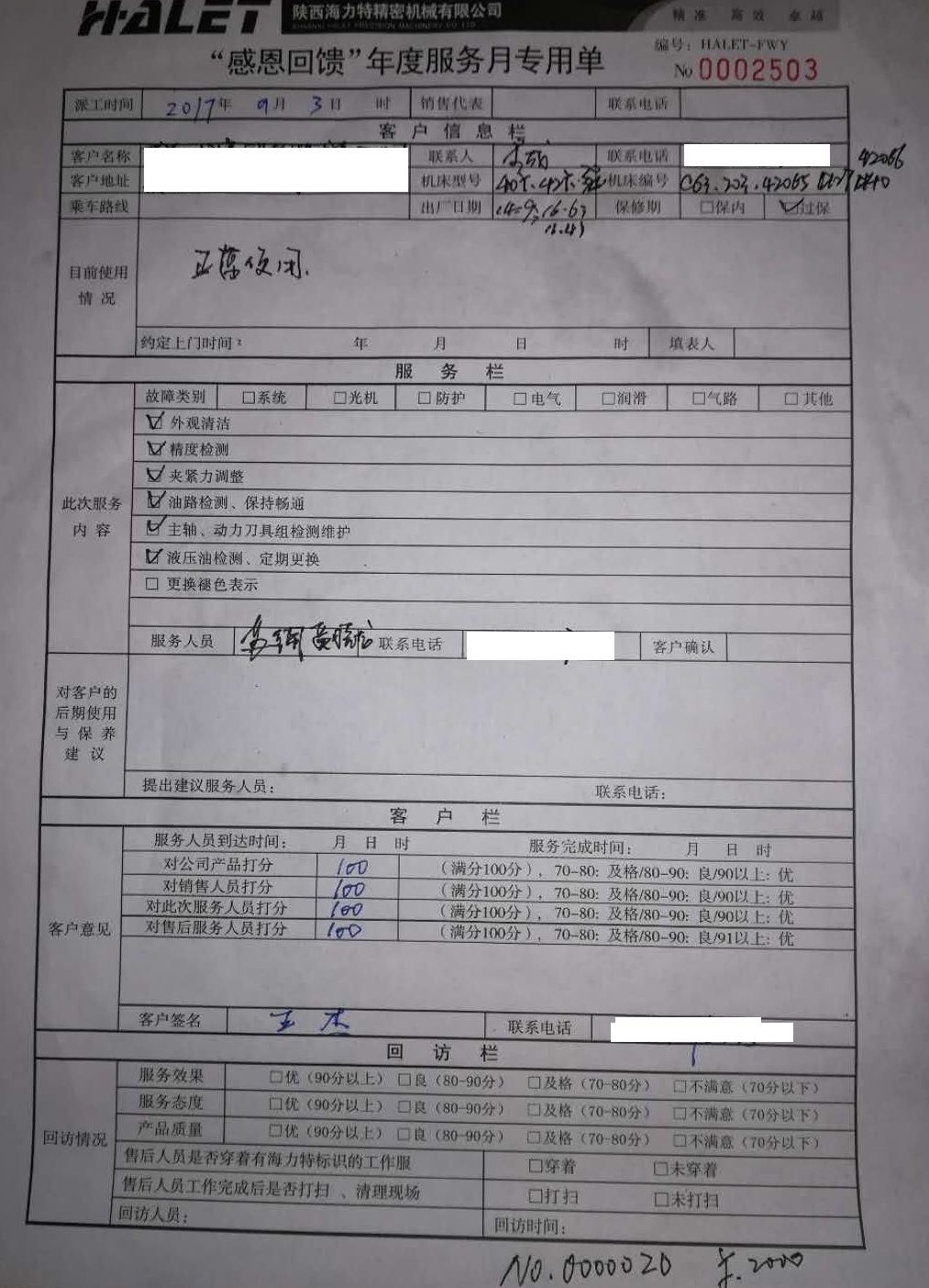 2017年9月,“感恩回饋,用心服務”海力特第三屆年度服務月拉開序幕,各組服務人員深入客戶現場認真檢修機床,用心服務客戶。真正做到讓客戶滿意,得到新老客戶的一致好評。